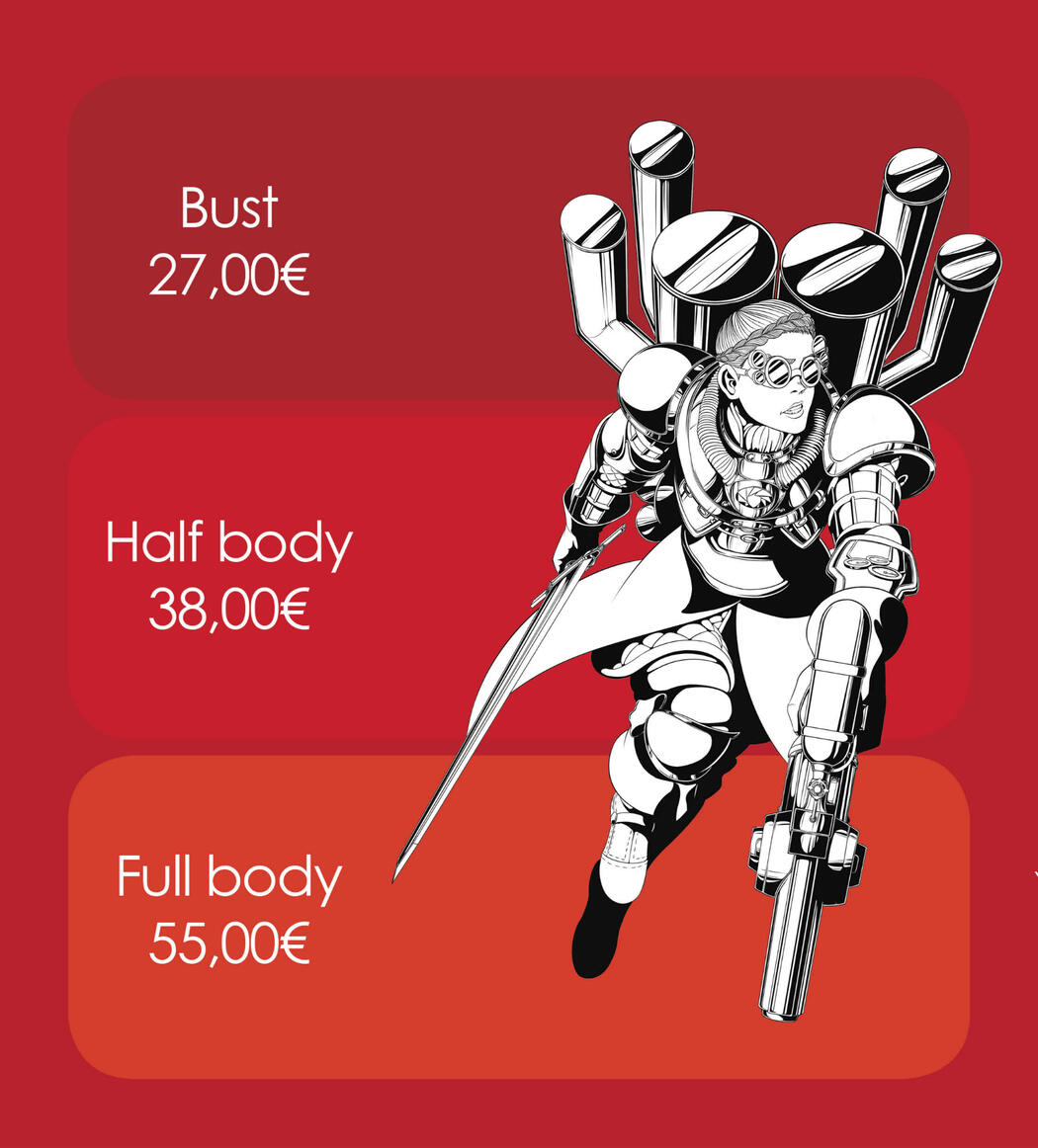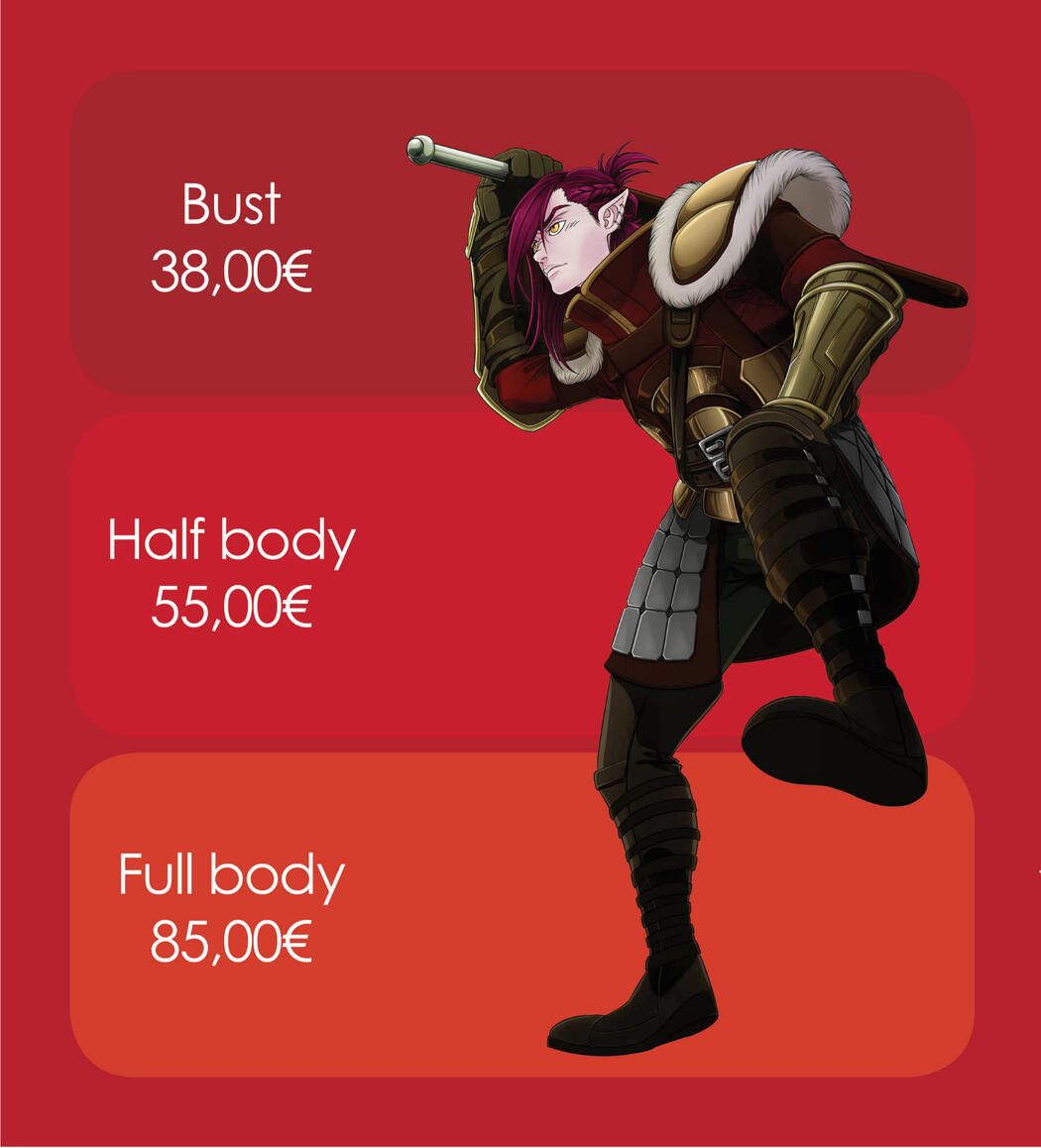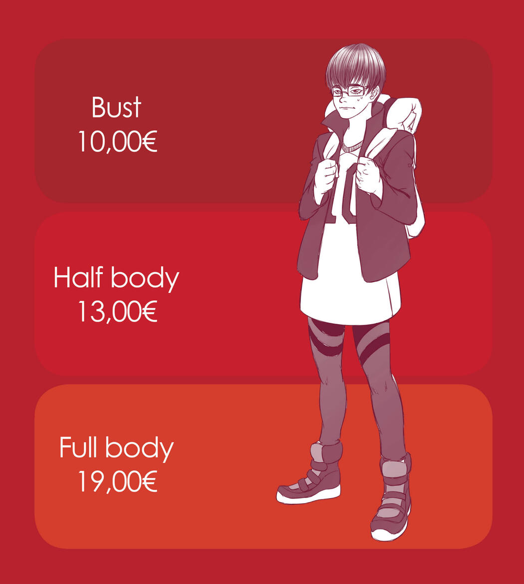 - All the prices displayed before, are base prices. That means for only one character of the options above.- Extra characters will have a 100% increasing each from the original price.- For original characters: if you haven't any reference of them and I have to visually build them from scrap, I'll requeest a fee of 40% of the base price in concept of "character constructon". That means I will take a couple of days working with you the concept art and construction sketches of the character, before doing the actual work.- If the character has complex decorations and accesories, depending of the difficulty, I can apply an extra between 30-100% of the original price for each complex character.- For nudes I will increase a 30% of the price for each nude character.- For furry (anthro) characters will have a 30-50% of extra, depending of the difficulty, each character.- For mechas I will put a 100%-200% of charge, depending of the difficulty. In case of mechanical prosthesis or accesories, it will be count on the "complex decorations and accesories" section instead here.- For frames I will apply a surcharge of 50%.- For backgorunds I will put between a 70-100% of extra charge, depending of the difficulty.- For deadlines I will take between a 20-200% of increase, depending if the finish date is far o near.- Last point but not less important: == These fees and prices are ONLY for private commissions.== If you want to develop a project, private or for a company, you need to speak with me vea email or social media direct message, and we can talk about pricing for them depending of the kind of work.